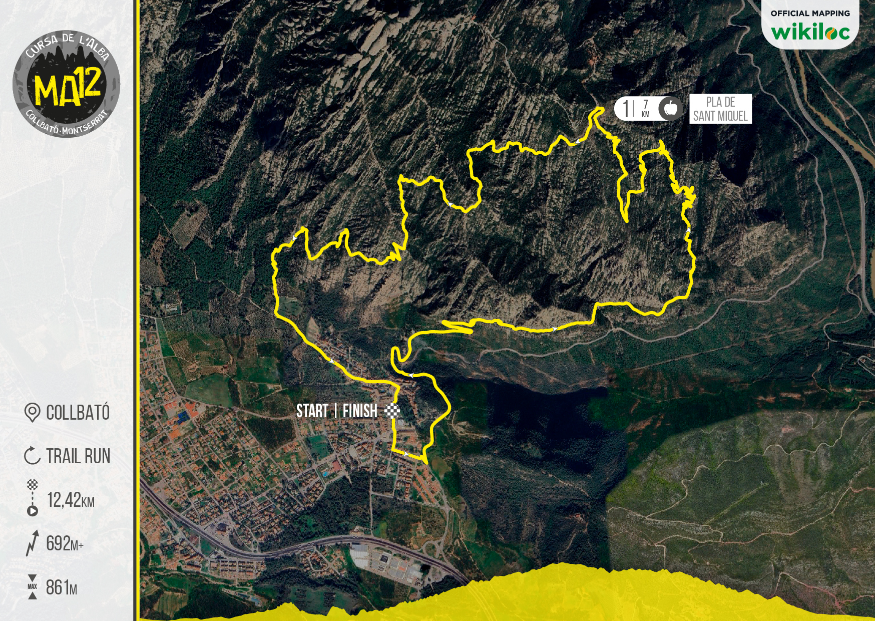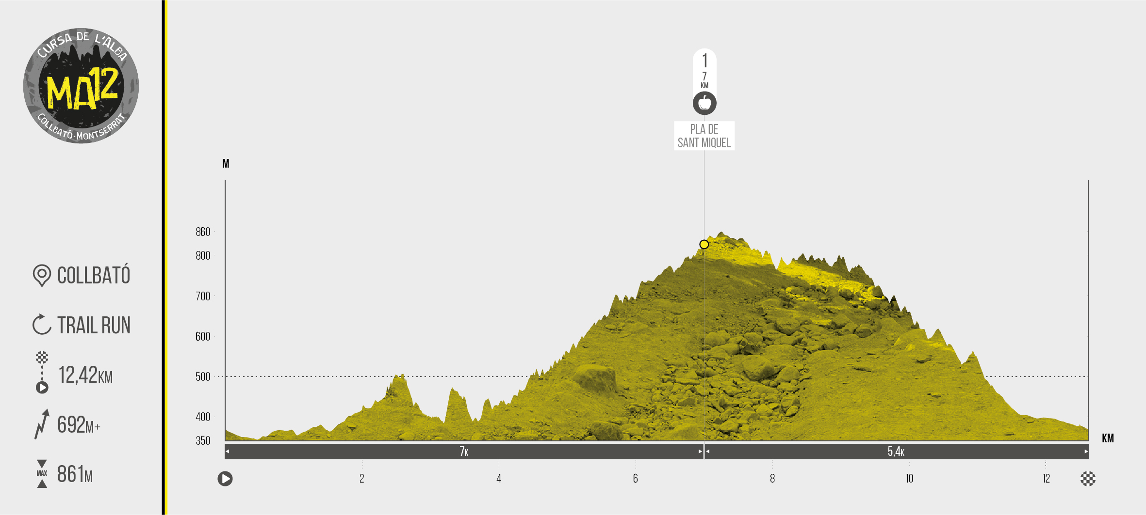 The MitjAlba is a race with a positive elevation gain of 600m+. The first two kilometres of the race run through the streets of Collbató, before entering a stretch of road and stairs. From this point onwards, you enter Montserrat Natural Park along a trail that leads you around the middle part of the massif on a slightly downhill stretch until approximately kilometre 3, where a steep climb begins up to Pla de San Miquel, the highest point of the route. Here begins a technical descent that will lead you down to the emblematic Taca Blanca or sheet to continue down to the finish line.